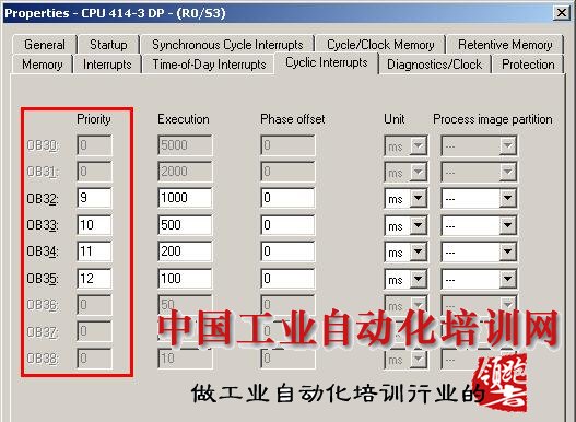 查看CPU属性循环中断页面(图4)中可查到OB34优先级为11,OB35优先级为12,所以OB35本地数据区大小默认为758字节,OB34本地数据区大小默认为256字节。由此可得知故障原因是由于CPU为OB34预分配的本地数据区太小(256<534)。