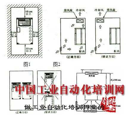 控制柜中安装变频器的上方柜顶要安装排风扇,如图2所示。控制柜中安装多台变频器要横向安装,且排风扇安装位置要正确,如图3所示。