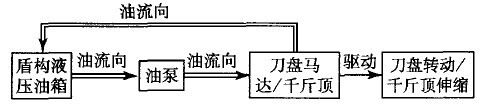 盾构机液压系统首先由电动机带动油泵从油箱中吸油,然后将具有压力的油液通过管路输送到刀盘驱动马达或推进千斤顶,将压力转化为机械能,驱动刀盘转动或千斤顶伸缩。盾构机液压循环如图2-19所示。